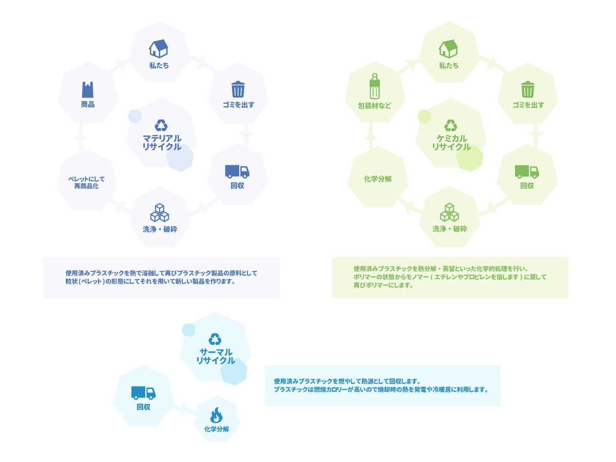 1.マテリアルリサイクルは使用済みプラスチックを熱で溶融して再びプラスチック製品の原料として粒状(ペレット)の形態にしてそれを用いて新しい製品を作ることです。ペレットにする際にまだ加工されていない新しい樹脂(バージン樹脂といいます)をブレンドする場合もあります。