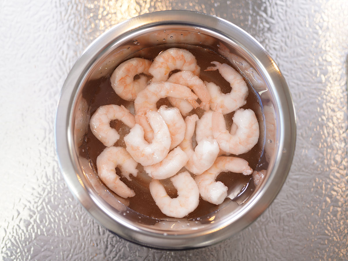 水を500ccと塩 大さじ1を混ぜたボウルを用意し、冷凍むき海老を入れます。半解凍にするため、30分置いておきます。