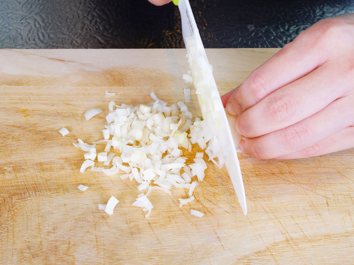 長ねぎをみじん切りに、青ねぎを小口切りにします。