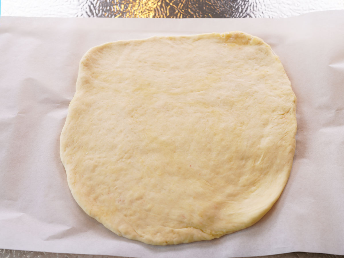 袋がパンパンに膨らんで生地が1.5倍程度の大きさになったらクッキングマットの上に出し、麺棒を使い縦15cm×横20cmの四角になるように伸ばします。