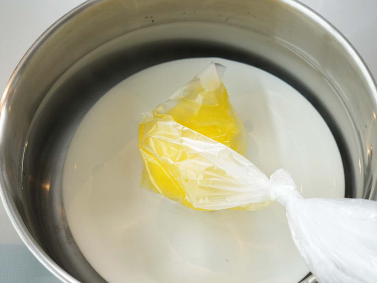 バターをポリ袋1に入れ、口を縛ります。鍋にお湯を沸かし、沸騰したら火を止めてバターを溶かします。