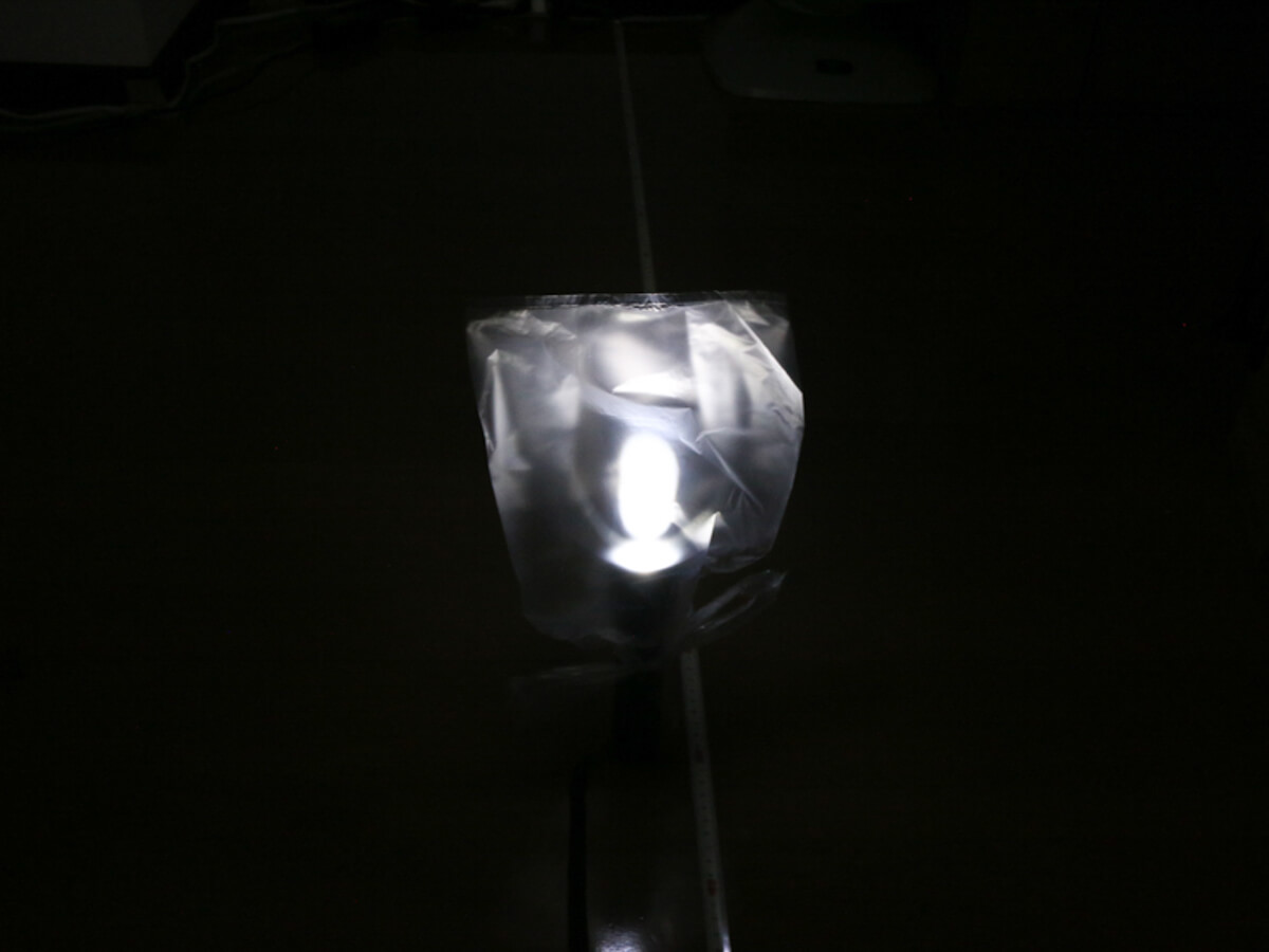 最後により中身が透けにくい白半透明のポリ袋「とって付きポリ袋 SS 白半透明」を使って作りました。半透明のポリ袋より明らかに光が広がって床が照らされているのがわかります。こちらは工事現場でよく見かけるバルーン型のライトと同じしくみです。一工夫加えるだけでこんなに明るさが変わるなんて不思議ですね。