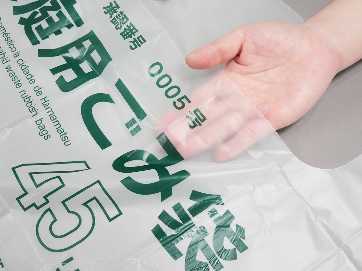 浜松市指定ごみ袋の印刷が施された半透明のごみ袋です。