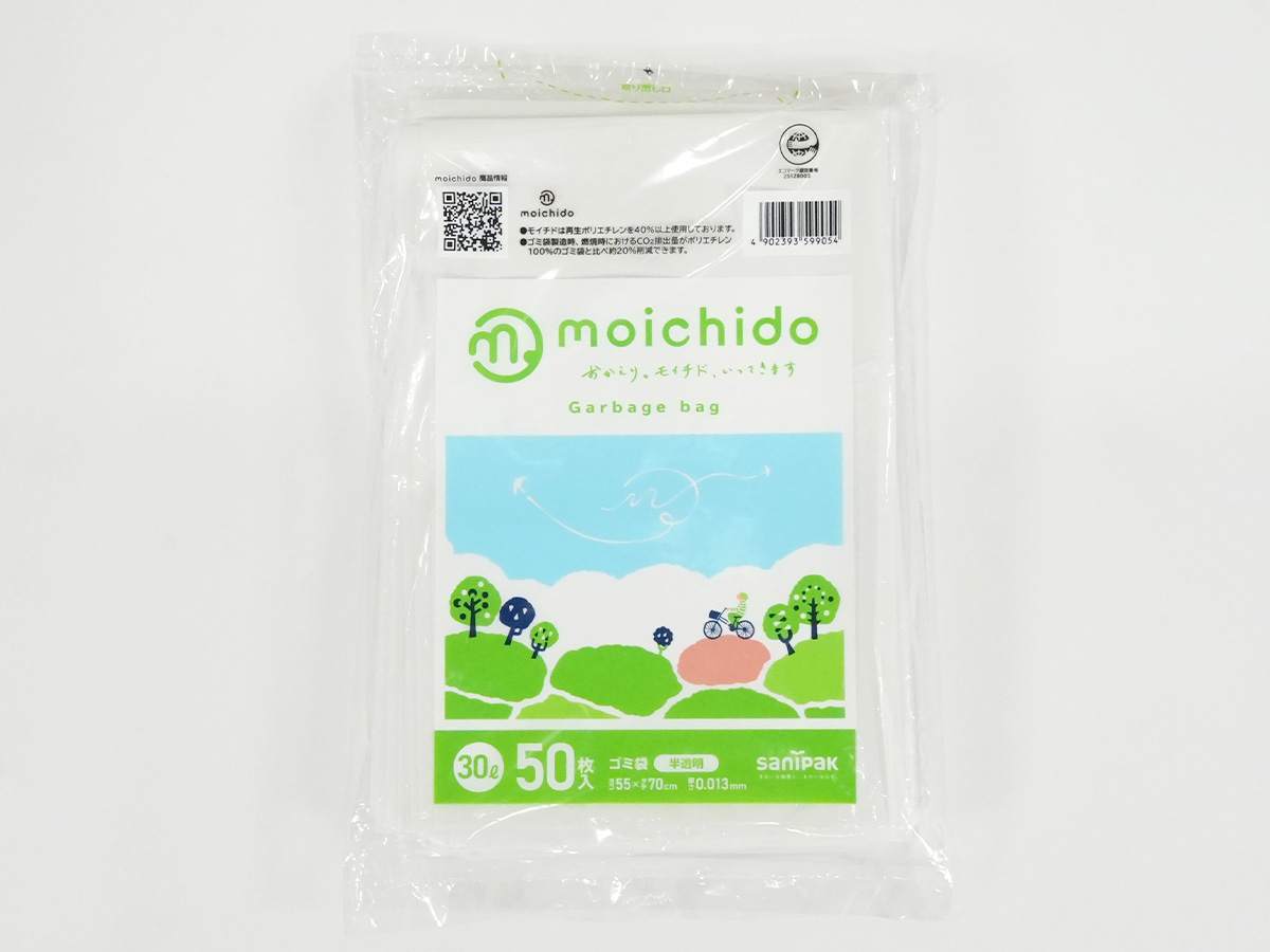 moichido(モイチド)は、再生ポリエチレンを40%以上使用した環境に配慮したゴミ袋です。「もう一度使う」ということから「moichido(モイチド)」となりました。