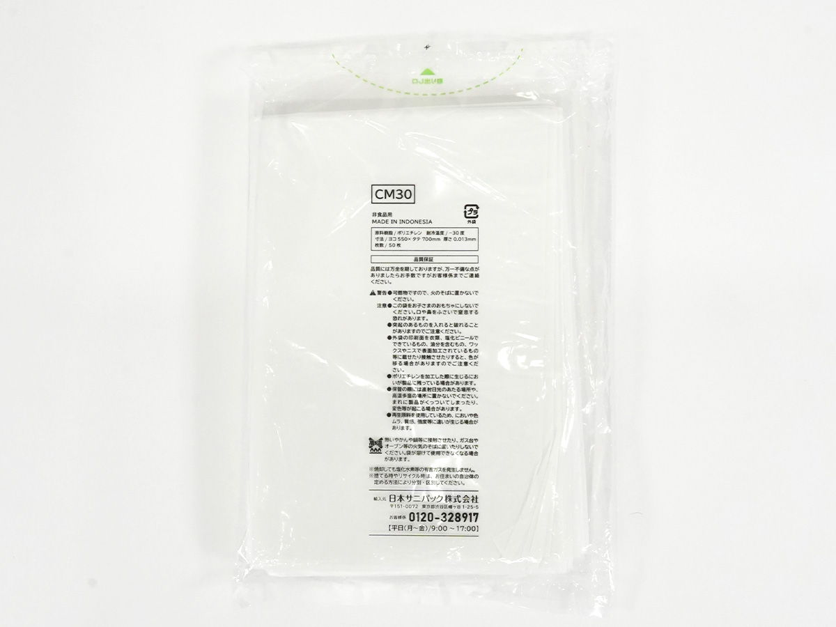 再生ポリエチレンを40%以上使用しており、ゴミ袋製造時、燃焼時におけるCO2排出量がポリエチレン100%のゴミ袋と比べ約20%削減できるゴミ袋です。半透明30L50枚タイプ。