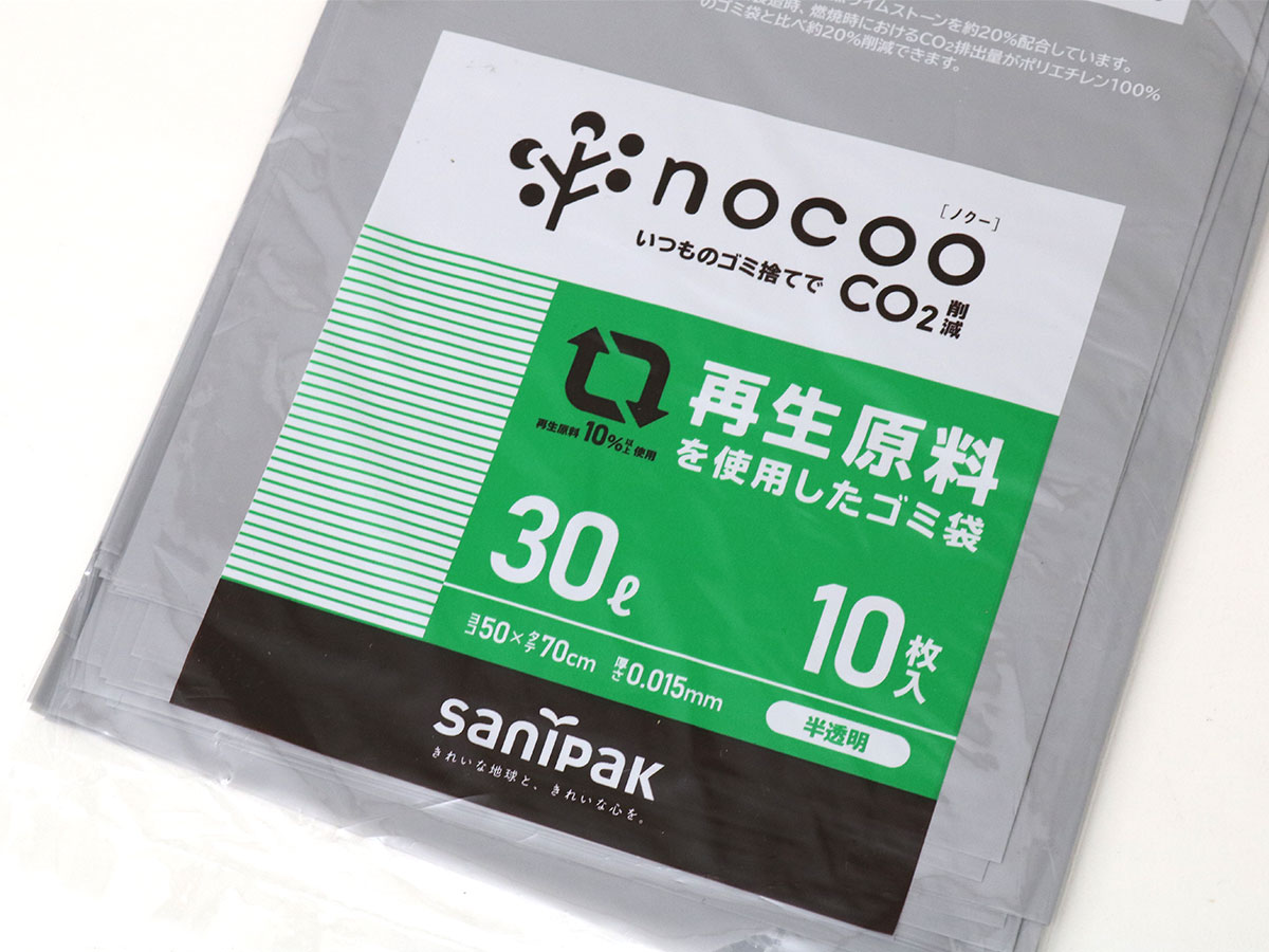 環境にやさしいゴミ袋「nocoo(ノクー)」と再生原料の色を活かした30Lゴミ袋。グレーな色合いの10枚タイプ。