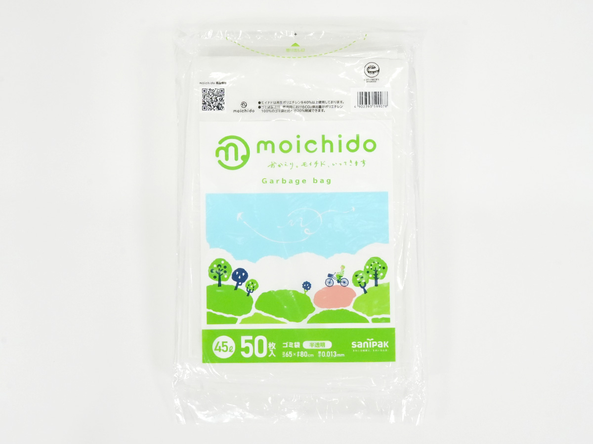 moichido(モイチド)は、再生ポリエチレンを40%以上使用した環境に配慮したゴミ袋です。「もう一度使う」ということから「moichido(モイチド)」となりました。