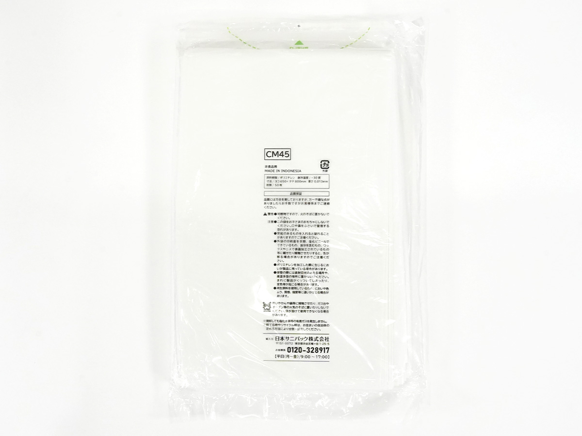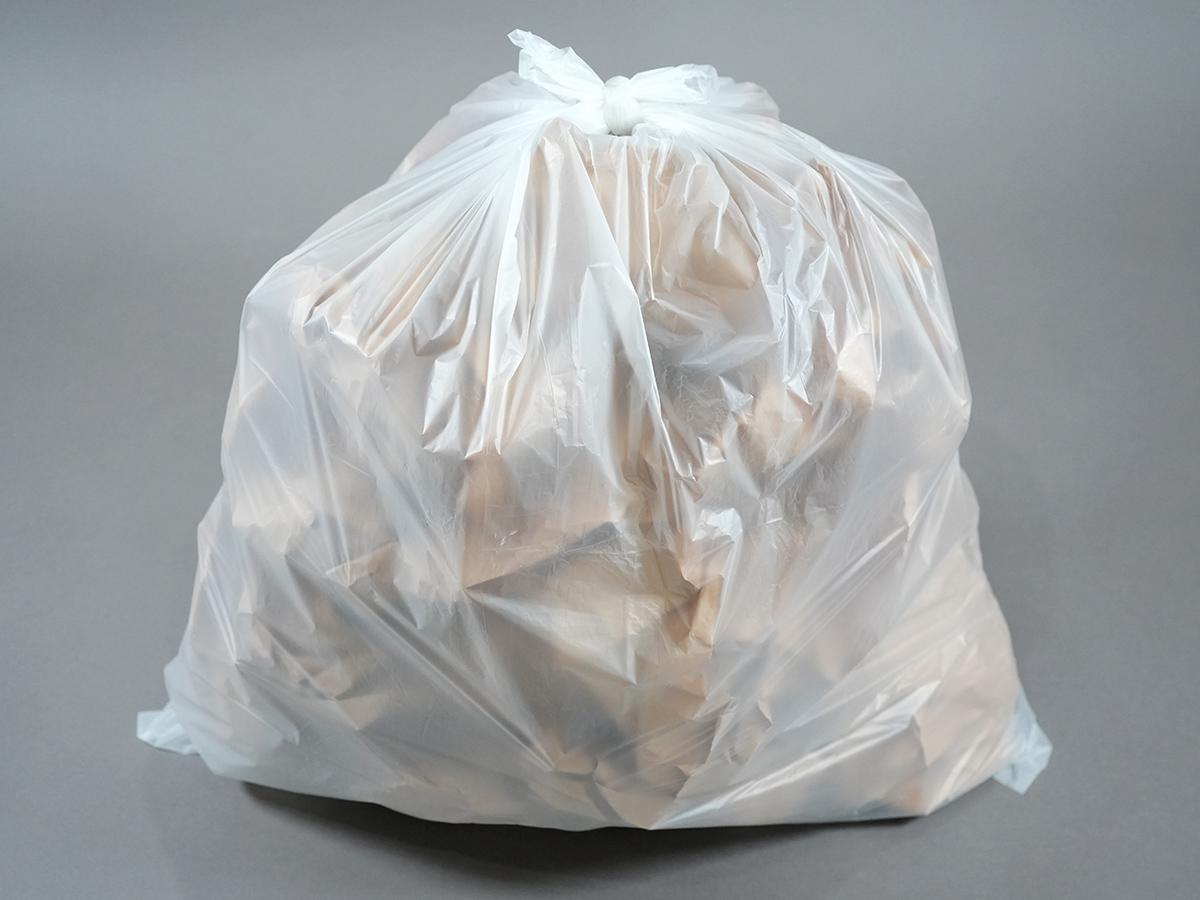 再生ポリエチレンを40%以上使用しており、ゴミ袋製造時、燃焼時におけるCO2排出量がポリエチレン100%のゴミ袋と比べ約20%削減できるゴミ袋です。半透明45L50枚タイプ。