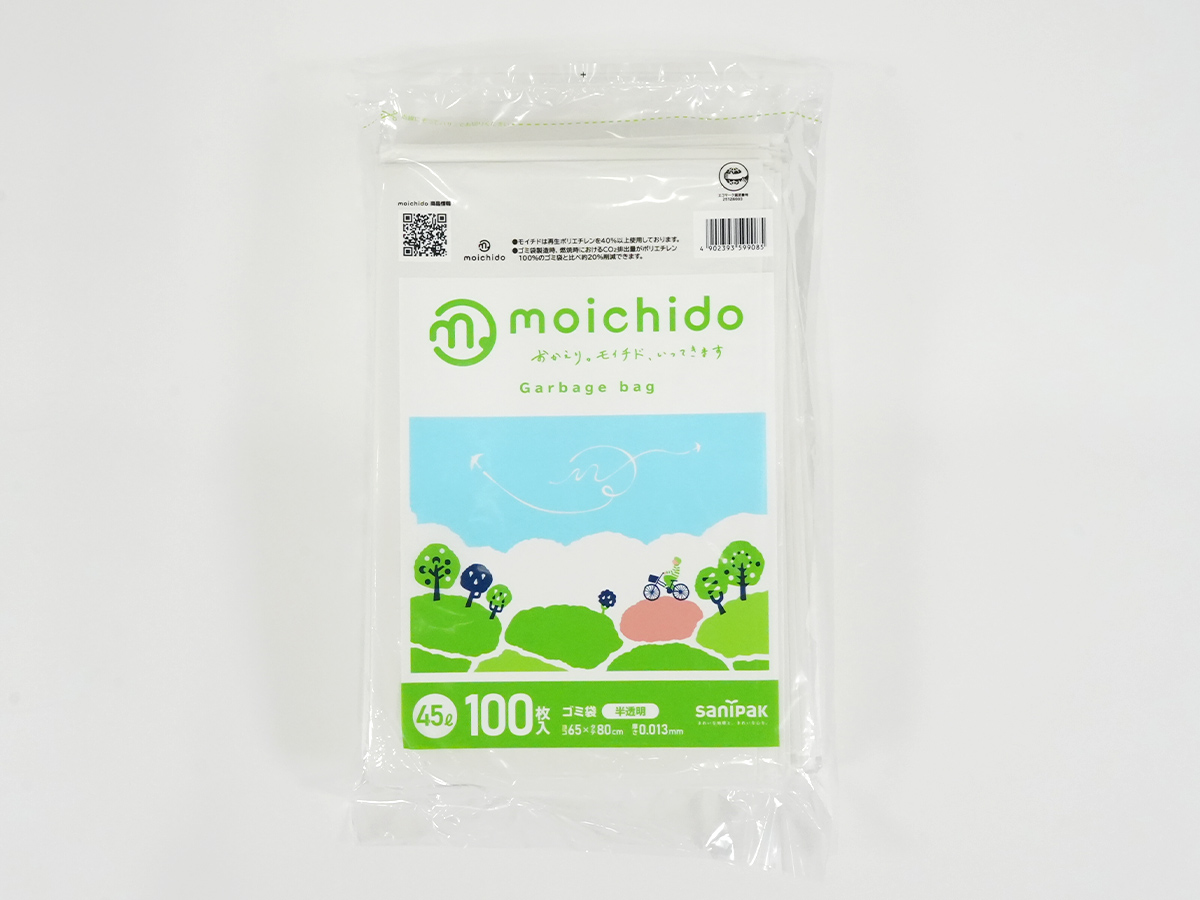 moichido(モイチド)は、再生ポリエチレンを40%以上使用した環境に配慮したゴミ袋です。「もう一度使う」ということから「moichido(モイチド)」となりました。