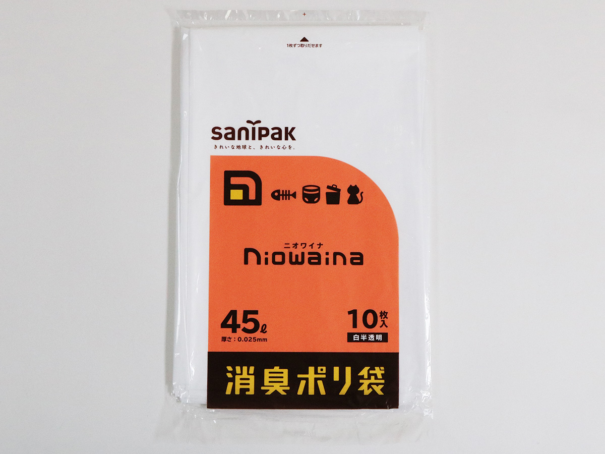 ニオワイナ消臭ポリ袋は、消臭成分を配合し、臭いを和らげることができるポリ袋シリーズの名称です。「臭いを否(イナ)」から「ニオワイナ(niowaina)」となりました。